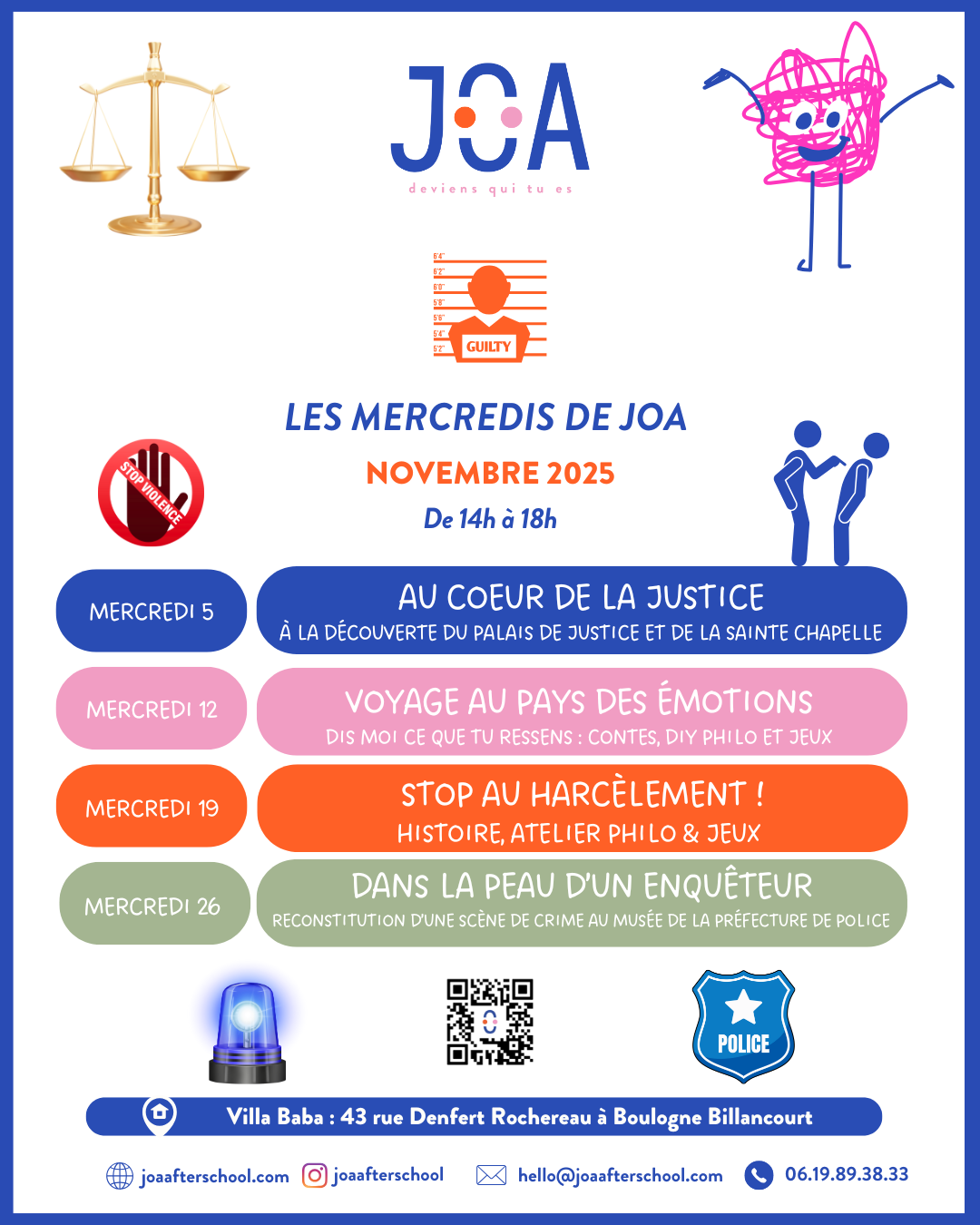 Mes 2 enfants de 8 et 10 ans ont adoré les ateliers JOA ! Eloquence , broderie , ateliers philo, impro - au delà de la diversité des activités c'est la qualité de l'accompagnement que je recommande ! J'aime l'esprit de JOA qui cherche à éveiller les consciences de nos enfants dans la joie !!!!!